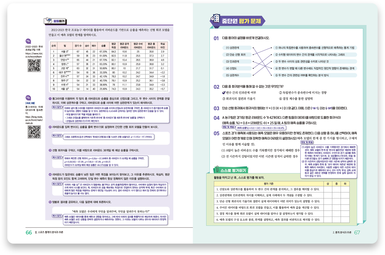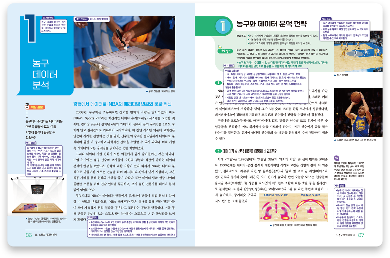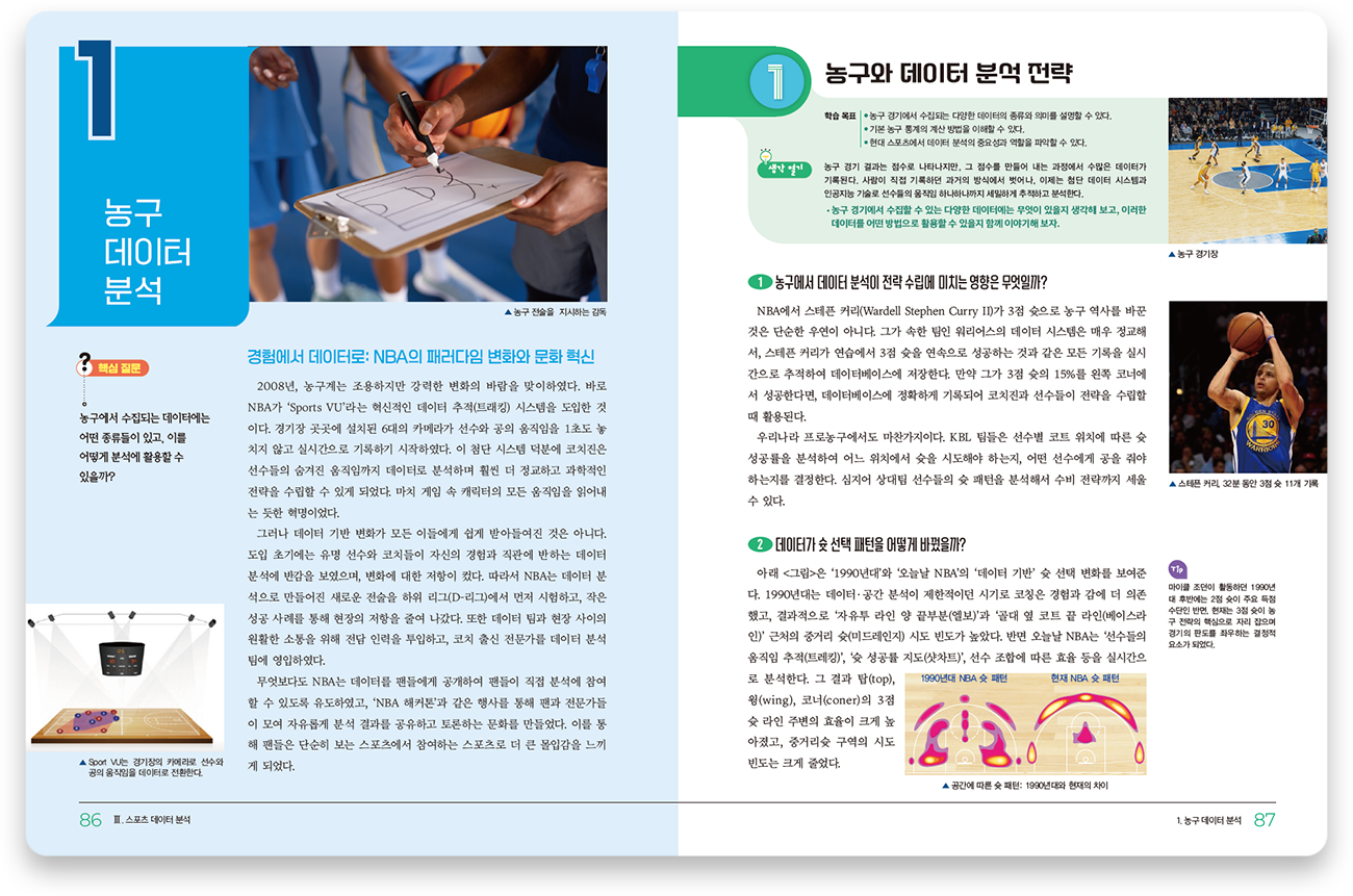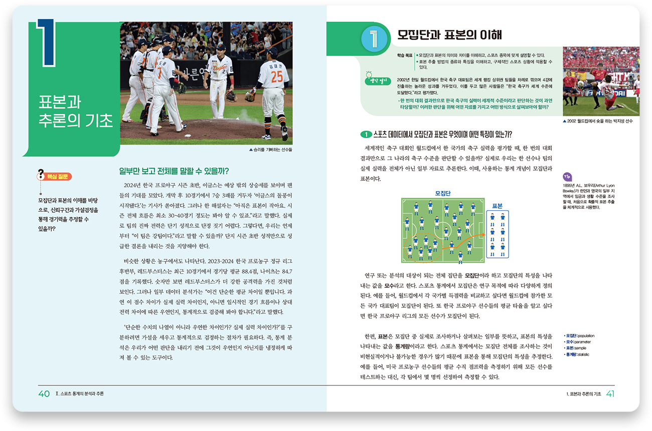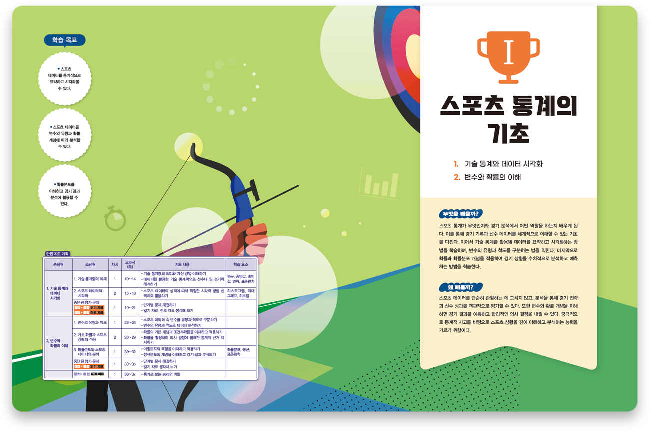 학생들이 체육과 통계 분야의 소양을 균형 있게 함양할 수 있도록 내용을 구성하였습니다.